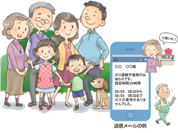 ガスのご利用状況を離れて暮らすご家族へメールでお知らせするサービスです。料理をしたり、お風呂に入ったり…普段の生活をしているだけで、元気な姿をご家族へ伝えることができます。